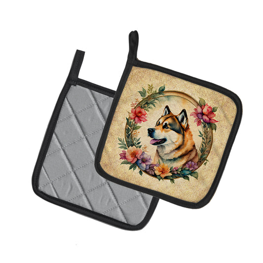 Akita and Flowers Pair of Pot Holders