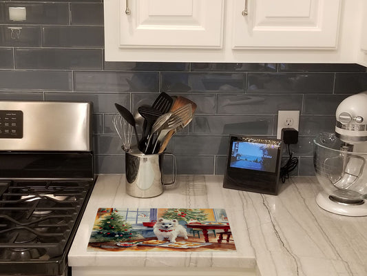 American Eskimo Cozy Christmas Glass Cutting Board