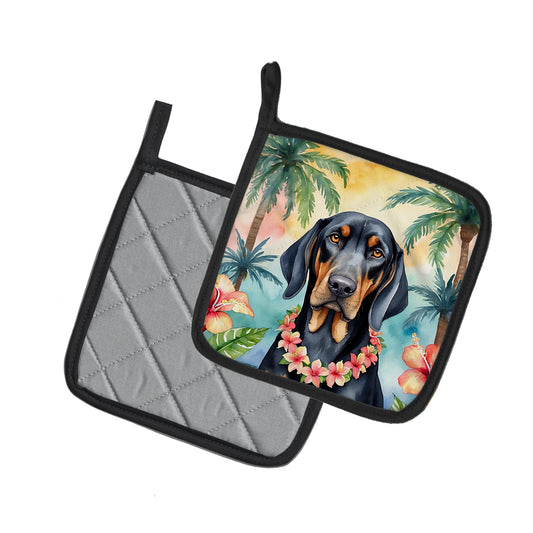 Black and Tan Coonhound Luau Pair of Pot Holders