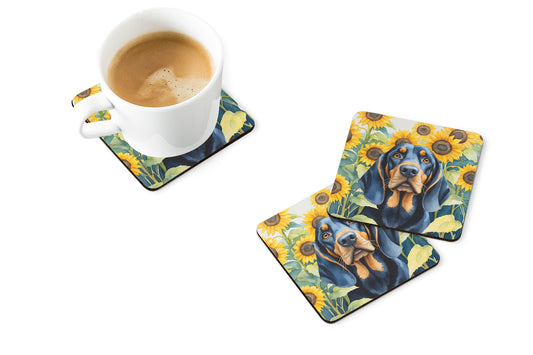 Black and Tan Coonhound in Sunflowers Foam Coasters