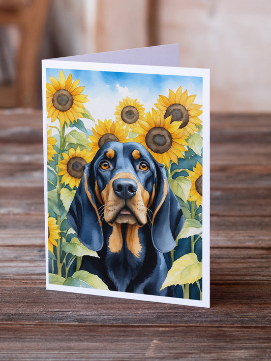 Black and Tan Coonhound in Sunflowers Greeting Cards Pack of 8