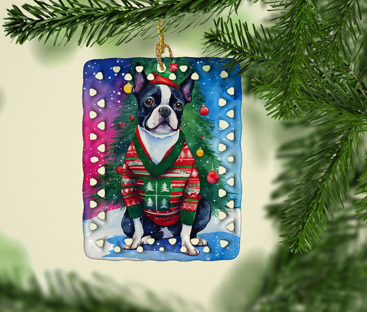 Boston Terrier Holiday Christmas Porcelain Ornament