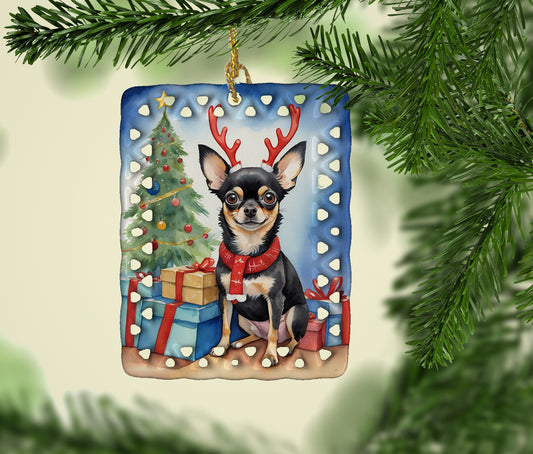 Black and Tan Chihuahua Christmas Reindeer Porcelain Ornament