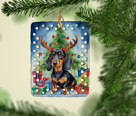 Black and Tan Dachshund Christmas Reindeer Porcelain Ornament