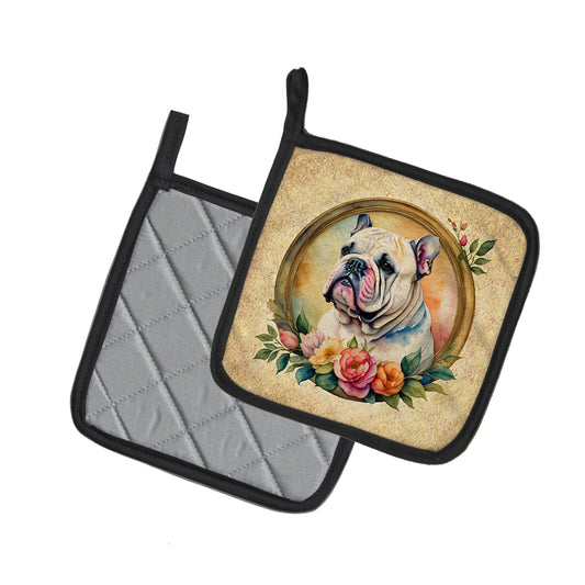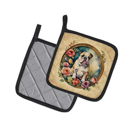 English Bulldog and Flowers Pair of Pot Holders