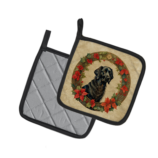 Flat-Coated Retriever Christmas Flowers Pair of Pot Holders