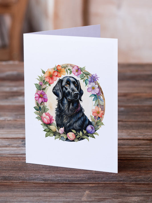 Flat-Coated Retriever and Flowers Greeting Cards and Envelopes Pack of 8