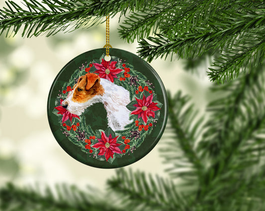 Fox Terrier Poinsetta Wreath Ceramic Ornament