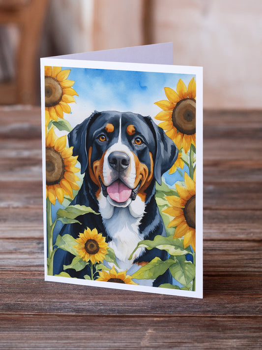 Greater Swiss Mountain Dog in Sunflowers Greeting Cards Pack of 8