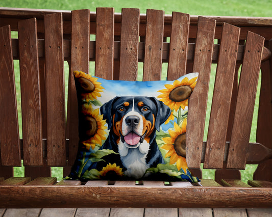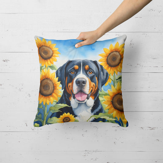 Greater Swiss Mountain Dog in Sunflowers Throw Pillow