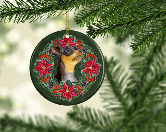 Miniature Pinscher Poinsetta Wreath Ceramic Ornament