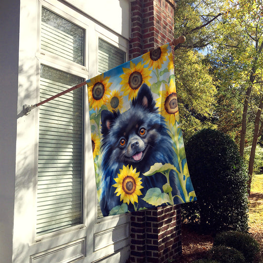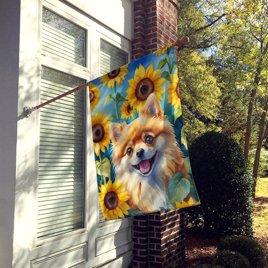 Pomeranian in Sunflowers House Flag