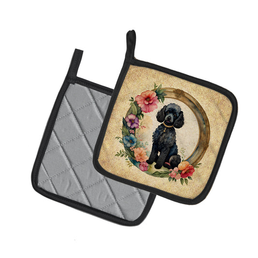 Black Poodle and Flowers Pair of Pot Holders