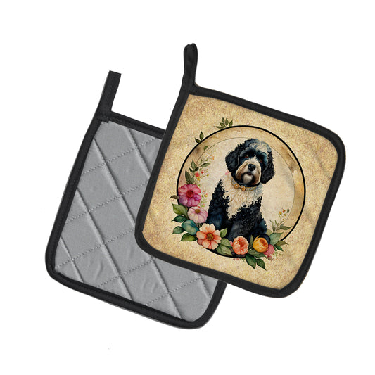 Portuguese Water Dog and Flowers Pair of Pot Holders