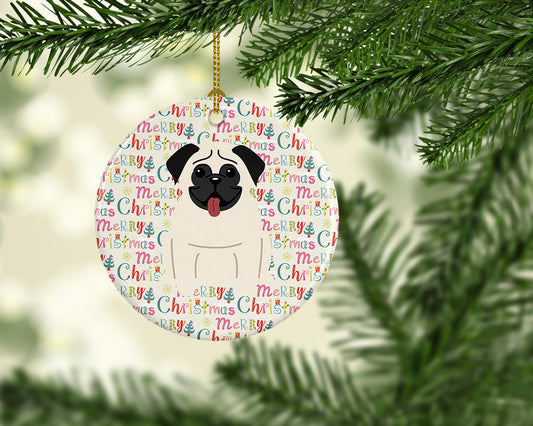 Merry Christmas Pug Cream Ceramic Ornament