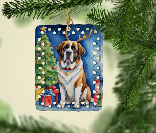 Saint Bernard Christmas Reindeer Porcelain Ornament