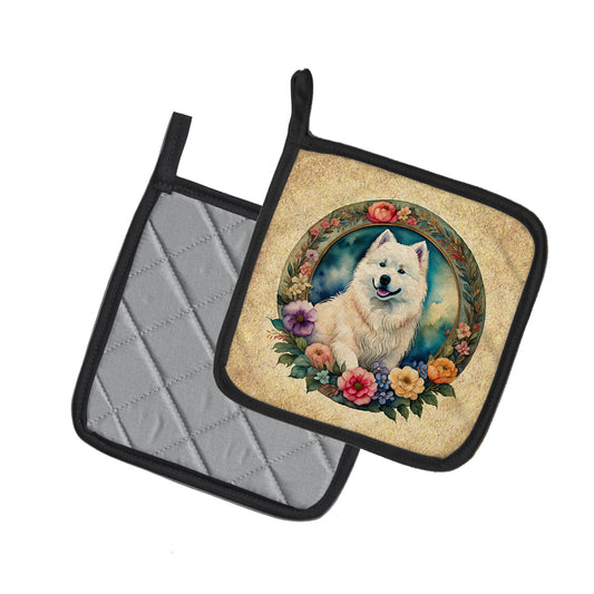 Samoyed and Flowers Pair of Pot Holders