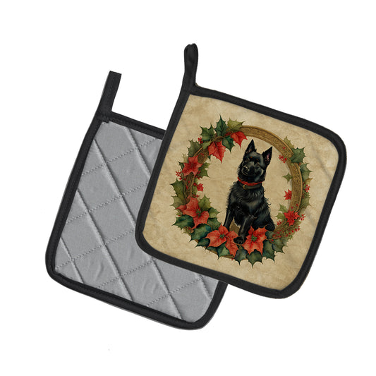Schipperke Christmas Flowers Pair of Pot Holders