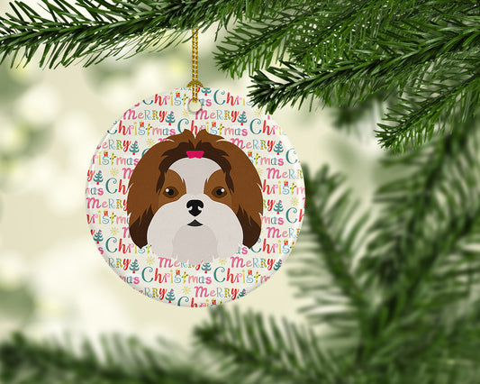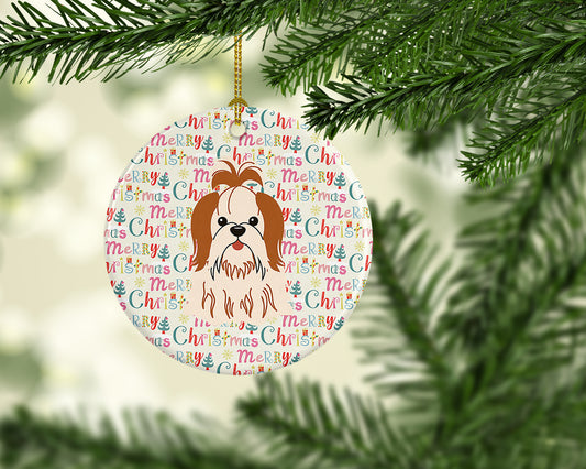 Merry Christmas Shih Tzu Red White Ceramic Ornament