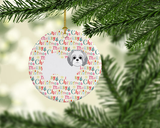 Merry Christmas Shih Tzu Silver White Ceramic Ornament