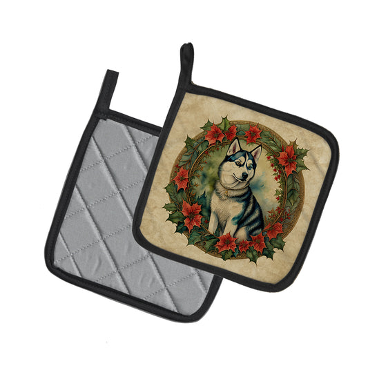 Siberian Husky Christmas Flowers Pair of Pot Holders