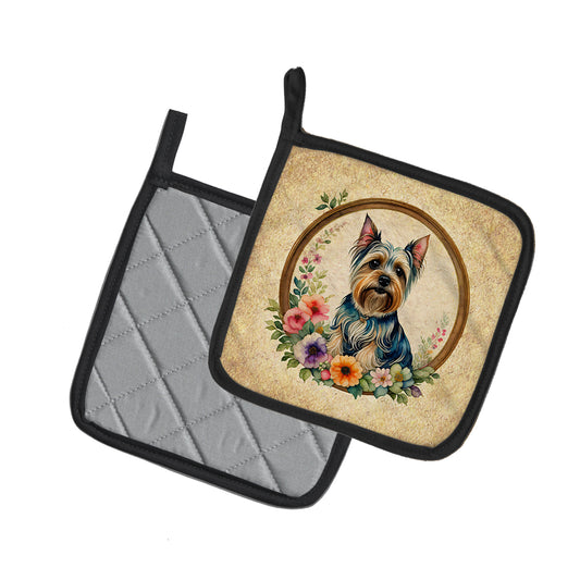 Silky Terrier and Flowers Pair of Pot Holders