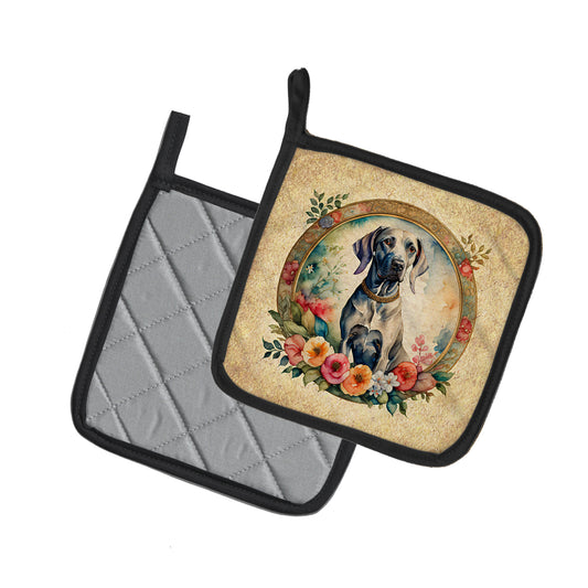 Weimaraner and Flowers Pair of Pot Holders