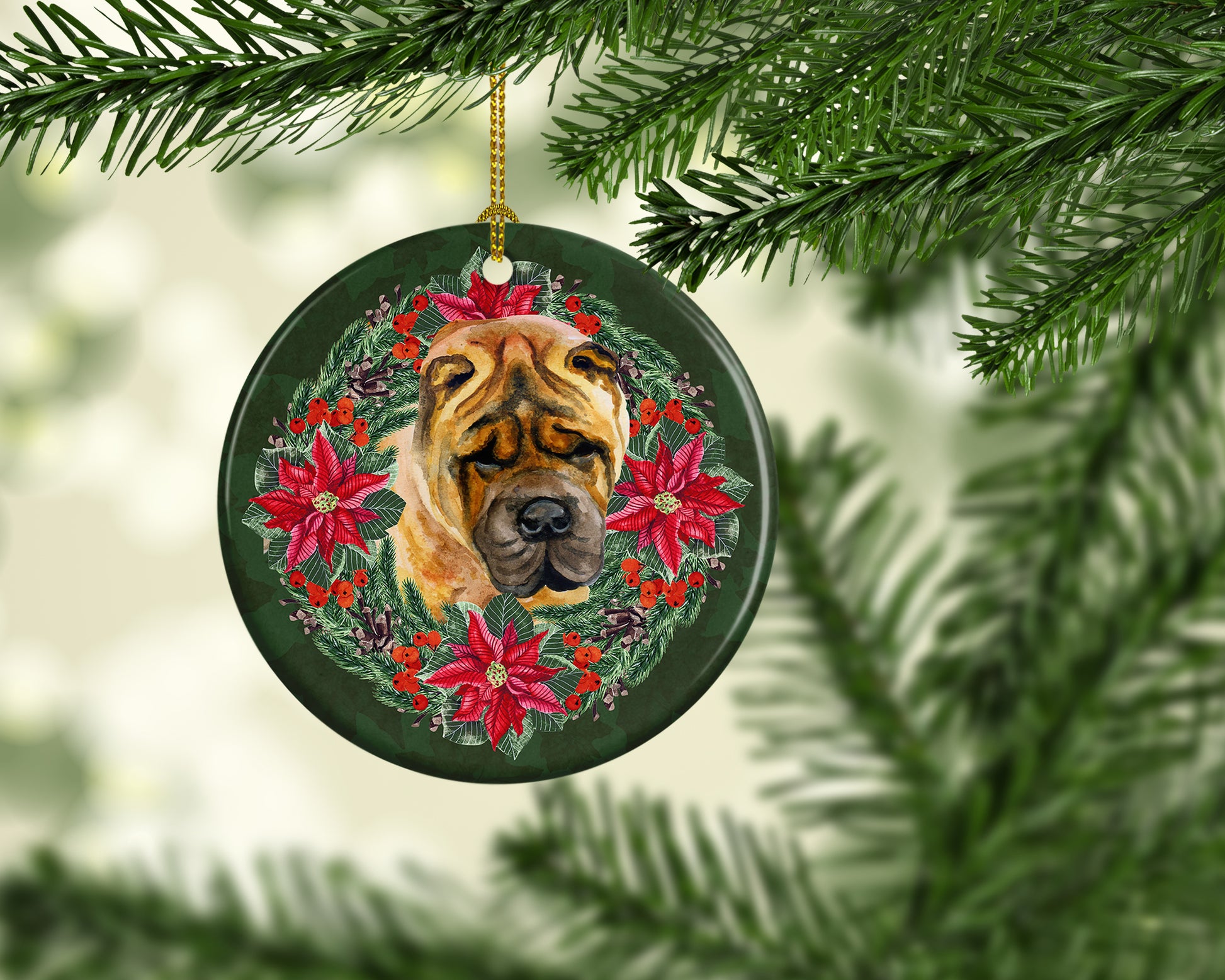 Ceramic Ornament featuring breed specific Shar Pei artwork. Celebrate Christmas with this Christmas Ornament. This Ceramic Ornament is from Caroline's Treasures collection Christmas Poinsetta Wreath. Add a touch of personalized charm to your Christmas tree this holiday season with our Ceramic Ornament. Measuring 2.8125 inches in diameter, this round porcelain ornament beautifully reflects your festive lights, enhancing your holiday decor. The gloss surface sets off the vibrant, full-color artwork contributed by one of our talented artists, bringing a pop of color and joy to your tree. This Ceramic Ornament doesn't stop at being merely decorative. The white back is designed for personalization. Write a heartfelt message, mark a special year, or inscribe a date with a paint pen or a permanent marker to create a treasured memento. Please ensure you allow any personalization to dry thoroughly before handling to maintain the pristine finish. Included with the ornament is a delicate gold cord for easy hanging. Made in the USA, this Ceramic Ornament makes an exceptional gift for a pet sitter, teacher, family member, or anyone you wish to share a little Christmas magic with. With its blend of style, charm, and personal touch, it's a meaningful addition to any Christmas tree. This Ornament is from Caroline's Treasures Dogs category of products.