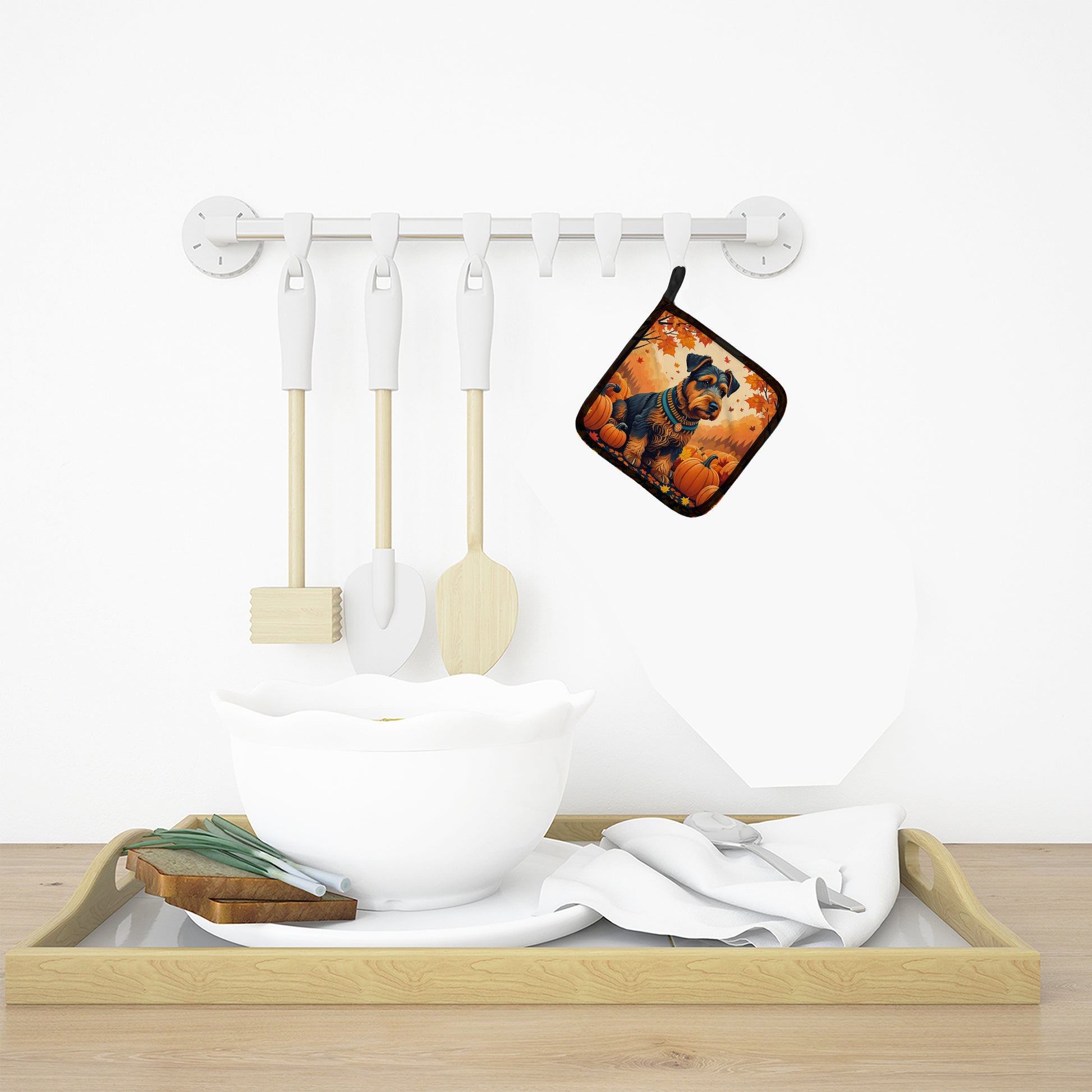Pair of Pot Holders featuring breed specific Airedale Terrier artwork. A Pair of Pot Holders to match your kitchen decor. Made in the USA these are thick and functional. Full color artwork decorates the front polyester fabric of the hot pad and accented by a black trim. Use these at as a trivet for your Thanksgiving or Christmas tablescape. Filled with insulated fabric and quilted for durability. These colorful pot holders will make a great gift for your favorite home cook or executive chef. Each pot holder measures approximately 7 1/2 inches by 7 1/2 inches. A hanging tab is included.