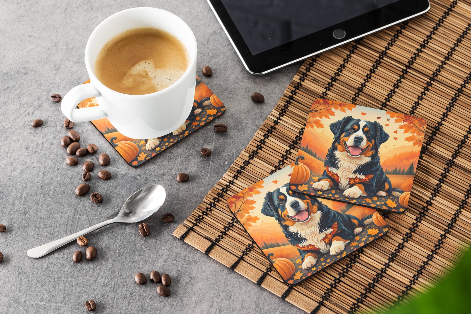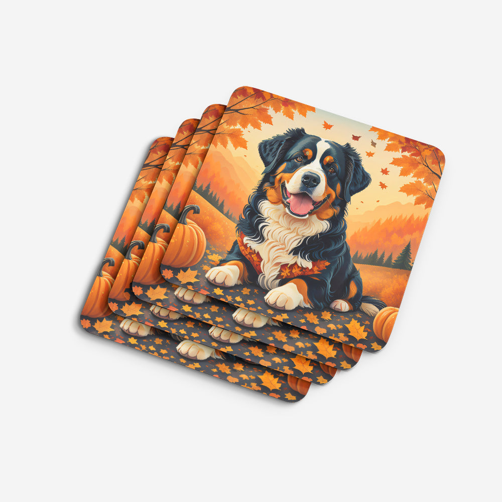 Foam Coasters featuring breed specific Bernese Mountain Dog artwork. Presenting our Set of 4 Foam Coasters, a stylish and practical addition to your table setting. Each square coaster, measuring 3 1/2 inches by 3 1/2 inches, is perfectly sized to accommodate various drinkware, from coffee mugs to tumblers. These coasters stand out with their full-color artwork, permanently dyed onto the material for a vibrant and fade-resistant finish. They're not just functional, they're a fashionable statement, adding a touch of flair to any gathering or event. Our foam coasters serve a dual purpose - they protect your table from water stains and are perfect for both hot and cold drinks. The material used is similar to that of our high-quality mouse pads, ensuring durability and heat resistance. These coasters are easy to maintain - simply wash them in the top of your dishwasher and lay flat to dry. The design won't come off, ensuring they retain their vivid colors for years. Pair them with one of our insulated coolers or huggers for a cohesive, thoughtful gift set. Enhance your beverage experience with our Set of 4 Foam Coasters.