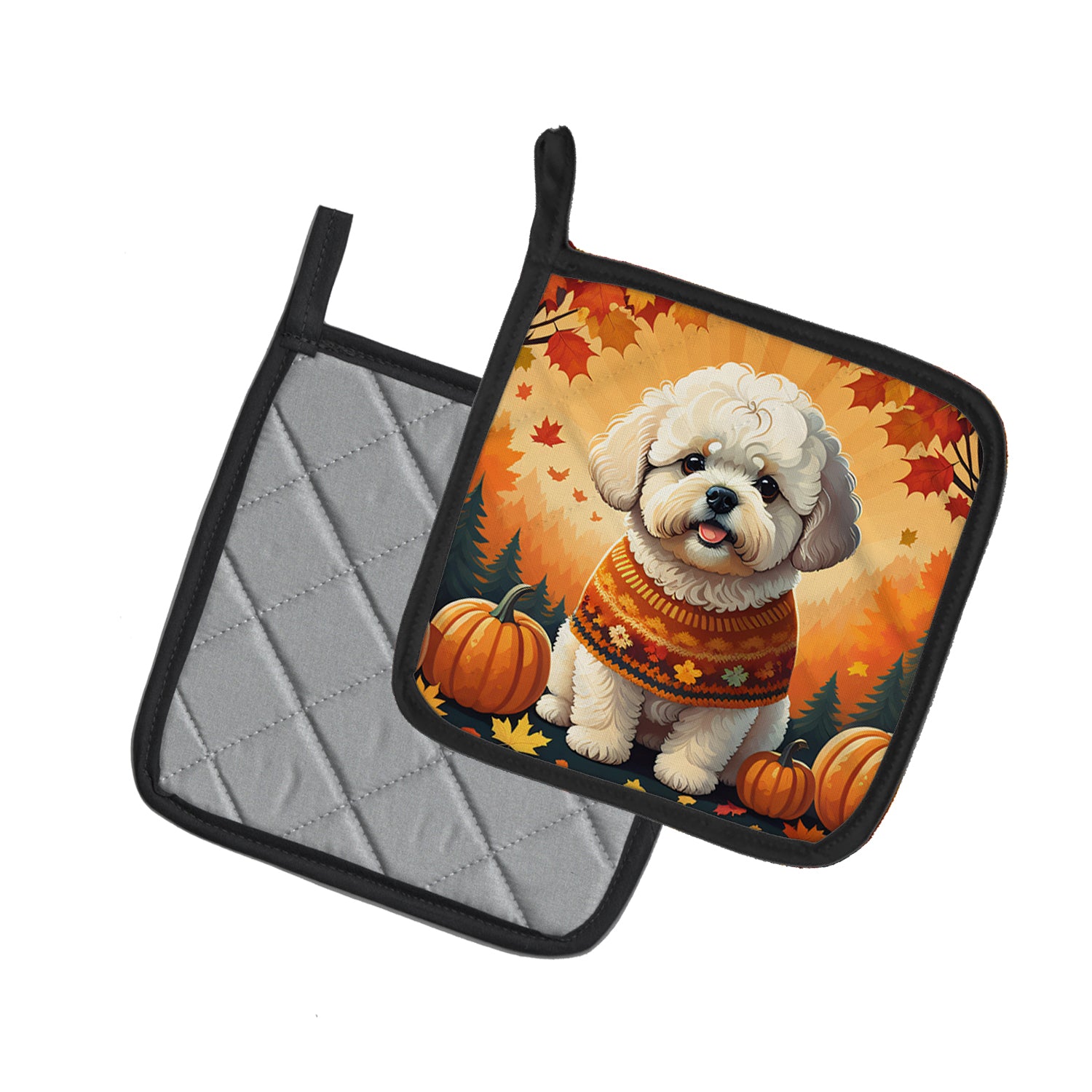 Pair of Pot Holders featuring breed specific Bichon Frise artwork. A Pair of Pot Holders to match your kitchen decor. Made in the USA these are thick and functional. Full color artwork decorates the front polyester fabric of the hot pad and accented by a black trim. Use these at as a trivet for your Thanksgiving or Christmas tablescape. Filled with insulated fabric and quilted for durability. These colorful pot holders will make a great gift for your favorite home cook or executive chef. Each pot holder measures approximately 7 1/2 inches by 7 1/2 inches. A hanging tab is included.