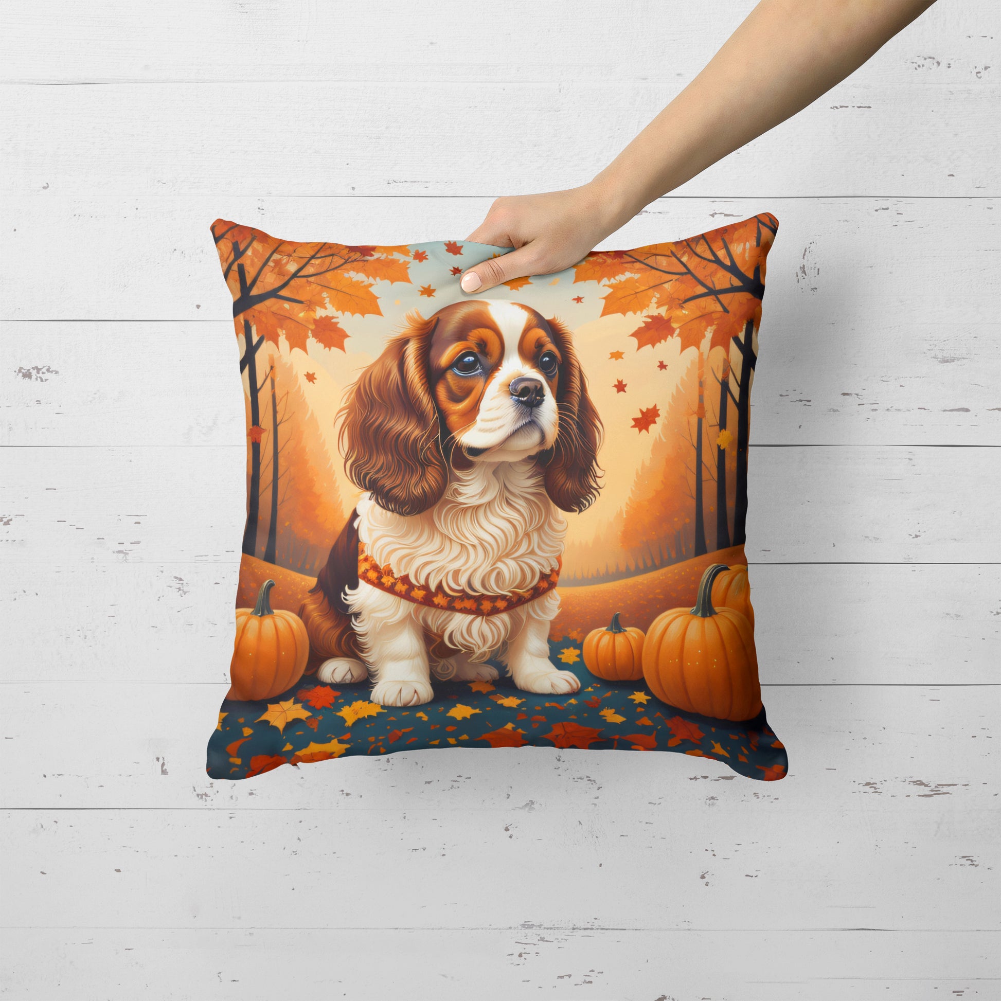 Throw Pillow featuring breed specific Cavalier Spaniel artwork. Revitalize your outdoor or indoor living space with Caroline's Treasures 18x18 Fabric Decorative Pillow. With a generously sized dimension of approximately 18 inches by 18 inches, this pillow makes a comfortable and aesthetic addition to any seating area. Made from a unique, water-resistant material developed by Caroline's Treasures, the pillow sham is 100% polyester fabric that's durable and ready to weather any condition. Its vibrant, full-color artwork will not fade over time as it is dyed with color-fast dyes. Whether you place it on your patio furniture, porch, veranda, or indoor couch, its soft canvas fabric ensures a cozy experience. The pillow is handcrafted in the United States, featuring a sham created from three pieces of fabric and a polyester insert for enduring shape and overstuffed comfort. Despite being robustly built to endure the outdoors, it is as soft and snug as your favorite indoor cushions. Please note, as all our pillows are handmade, sizes may vary slightly, adding to the charm of this unique decorative item.