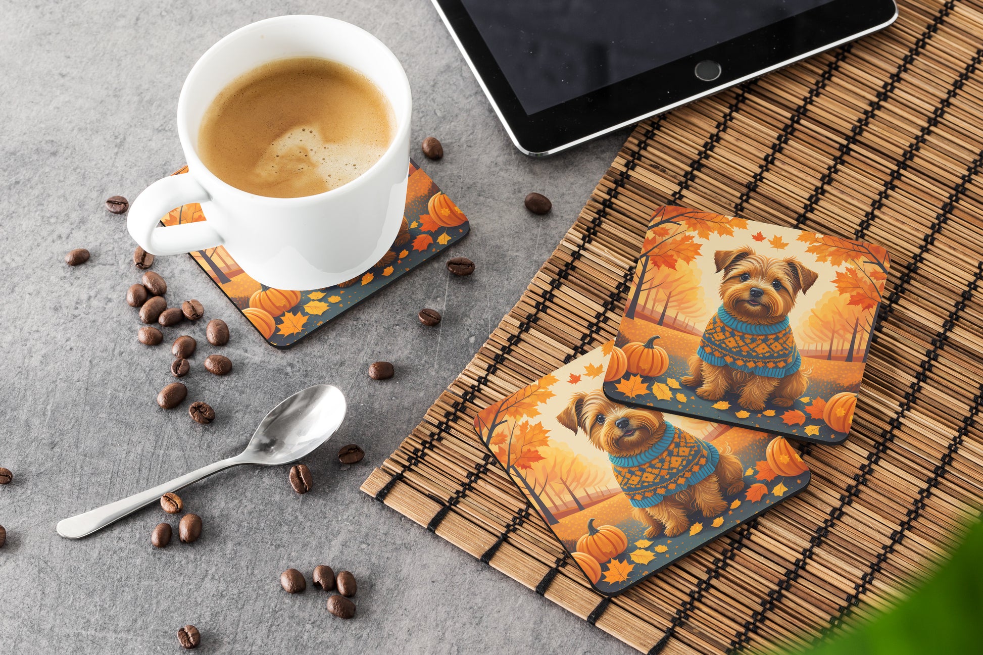 Foam Coasters featuring breed specific Norfolk Terrier artwork. Presenting our Set of 4 Foam Coasters, a stylish and practical addition to your table setting. Each square coaster, measuring 3 1/2 inches by 3 1/2 inches, is perfectly sized to accommodate various drinkware, from coffee mugs to tumblers. These coasters stand out with their full-color artwork, permanently dyed onto the material for a vibrant and fade-resistant finish. They're not just functional, they're a fashionable statement, adding a touch of flair to any gathering or event. Our foam coasters serve a dual purpose - they protect your table from water stains and are perfect for both hot and cold drinks. The material used is similar to that of our high-quality mouse pads, ensuring durability and heat resistance. These coasters are easy to maintain - simply wash them in the top of your dishwasher and lay flat to dry. The design won't come off, ensuring they retain their vivid colors for years. Pair them with one of our insulated coolers or huggers for a cohesive, thoughtful gift set. Enhance your beverage experience with our Set of 4 Foam Coasters.