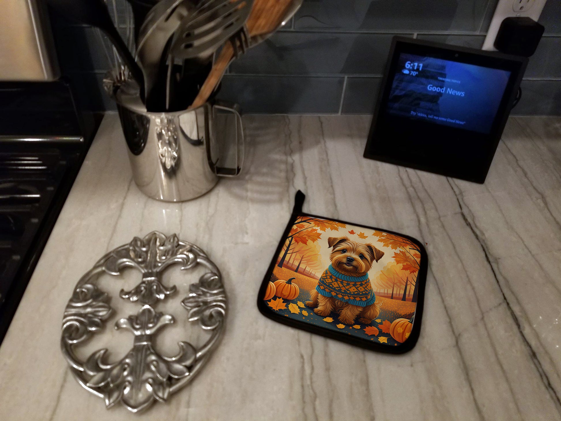 Pair of Pot Holders featuring breed specific Norfolk Terrier artwork. A Pair of Pot Holders to match your kitchen decor. Made in the USA these are thick and functional. Full color artwork decorates the front polyester fabric of the hot pad and accented by a black trim. Use these at as a trivet for your Thanksgiving or Christmas tablescape. Filled with insulated fabric and quilted for durability. These colorful pot holders will make a great gift for your favorite home cook or executive chef. Each pot holder measures approximately 7 1/2 inches by 7 1/2 inches. A hanging tab is included.