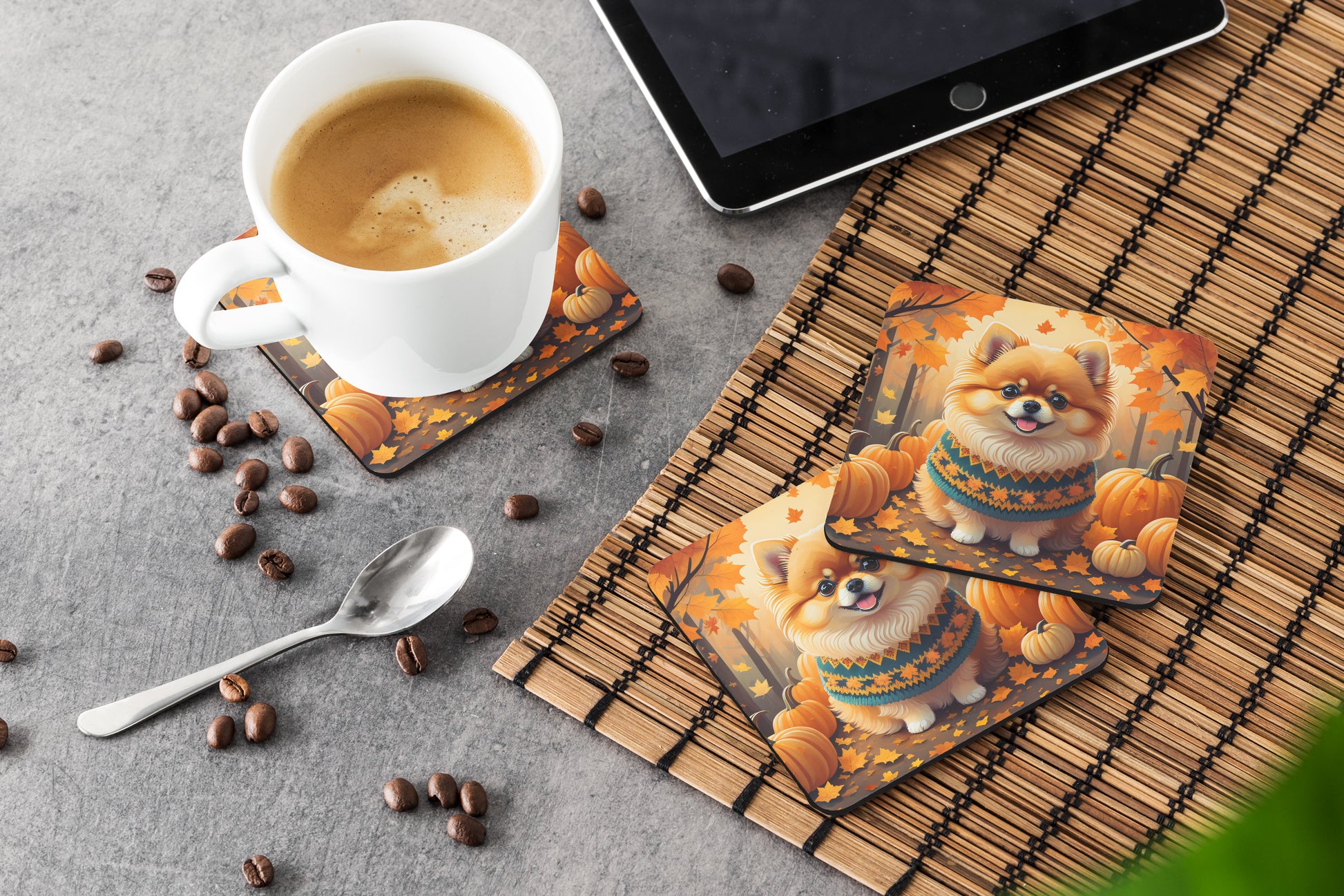 Foam Coasters featuring breed specific Pomeranian artwork. Presenting our Set of 4 Foam Coasters, a stylish and practical addition to your table setting. Each square coaster, measuring 3 1/2 inches by 3 1/2 inches, is perfectly sized to accommodate various drinkware, from coffee mugs to tumblers. These coasters stand out with their full-color artwork, permanently dyed onto the material for a vibrant and fade-resistant finish. They're not just functional, they're a fashionable statement, adding a touch of flair to any gathering or event. Our foam coasters serve a dual purpose - they protect your table from water stains and are perfect for both hot and cold drinks. The material used is similar to that of our high-quality mouse pads, ensuring durability and heat resistance. These coasters are easy to maintain - simply wash them in the top of your dishwasher and lay flat to dry. The design won't come off, ensuring they retain their vivid colors for years. Pair them with one of our insulated coolers or huggers for a cohesive, thoughtful gift set. Enhance your beverage experience with our Set of 4 Foam Coasters.