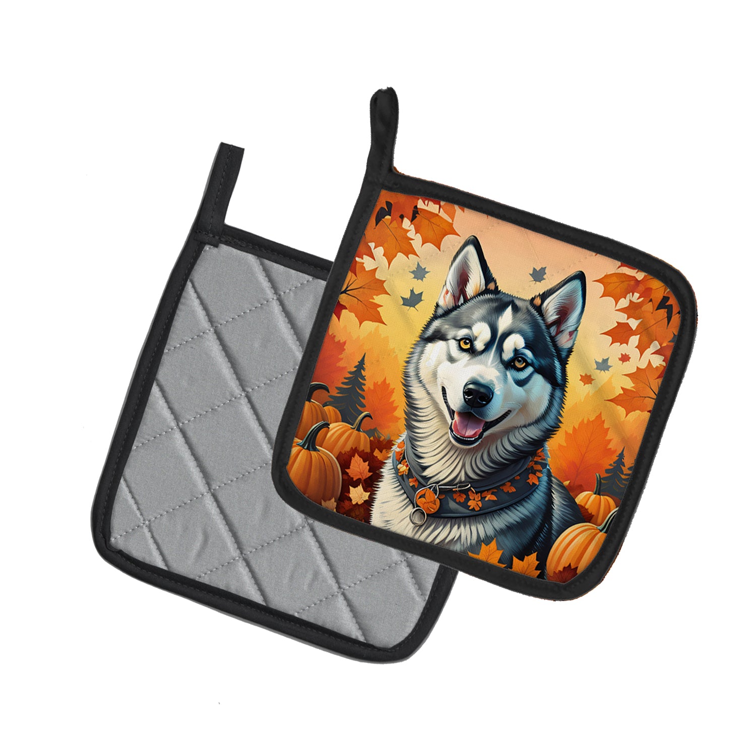 Pair of Pot Holders featuring breed specific Siberian Husky artwork. A Pair of Pot Holders to match your kitchen decor. Made in the USA these are thick and functional. Full color artwork decorates the front polyester fabric of the hot pad and accented by a black trim. Use these at as a trivet for your Thanksgiving or Christmas tablescape. Filled with insulated fabric and quilted for durability. These colorful pot holders will make a great gift for your favorite home cook or executive chef. Each pot holder measures approximately 7 1/2 inches by 7 1/2 inches. A hanging tab is included.