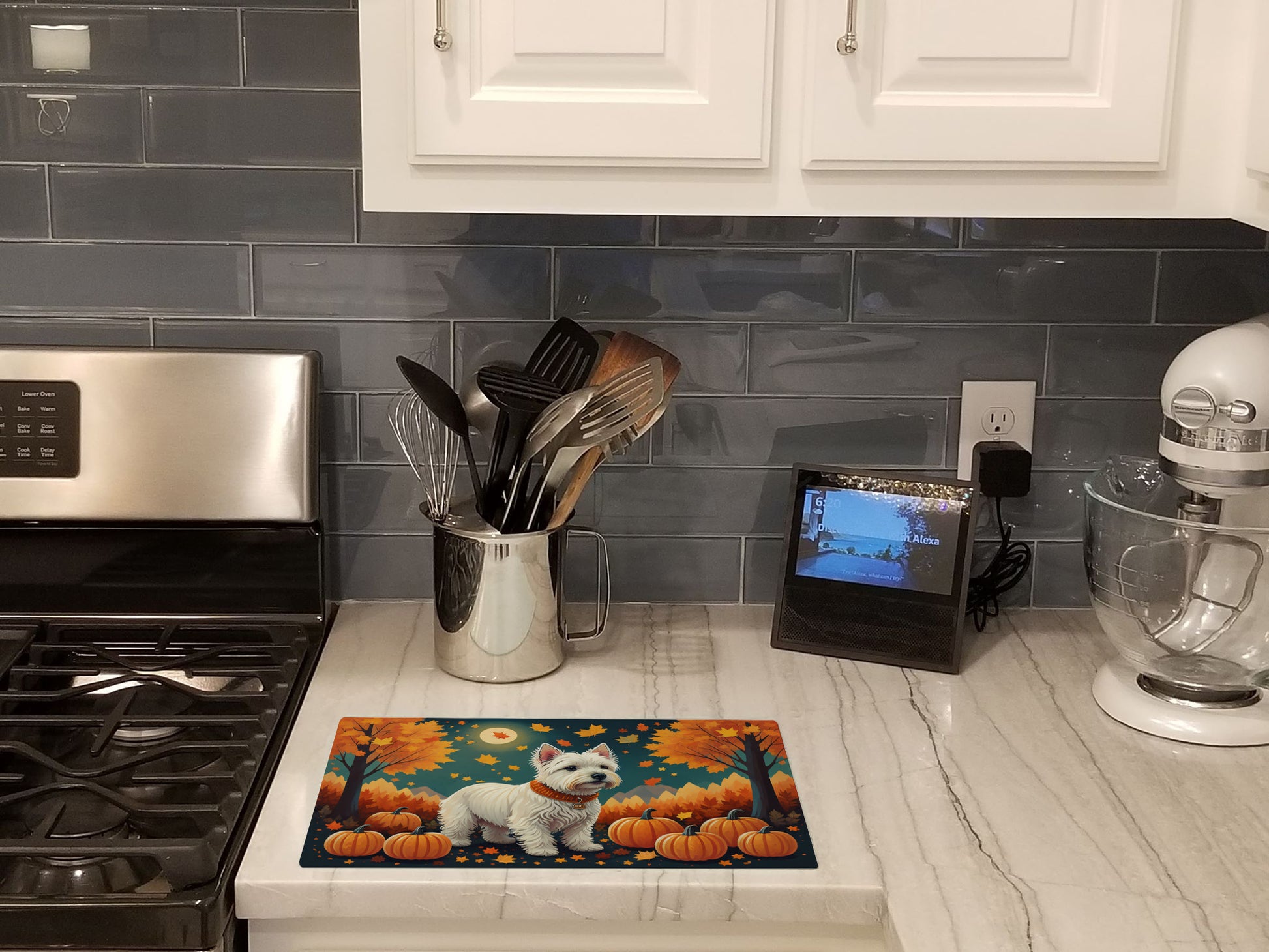 Glass Cutting Board featuring breed specific West Highland White Terrier artwork. Introduce your kitchen to the vibrant, large Decorative Glass Cutting Board from Caroline's Treasures. Crafted from resilient tempered glass, this board is not only a utilitarian necessity but also a colorful art piece. With its generous dimensions of 15 inches in height and 12 inches in length, it offers ample space for all your cutting needs. Every piece showcases captivating artwork from distinguished artists, bringing an aesthetic edge to your kitchen. Beyond its attractive design, this cutting board ensures your countertop stays pristine and unscathed, owing to its heat-resistant properties. Engineered with user convenience in mind, it features non-skid feet for stability, and rounded corners for additional safety. Its robust construction renders it virtually unbreakable, guaranteeing longevity. The board comes with protective feet bumpers, maintaining its position during use. This product is recommended to be hand washed only. Proudly printed and assembled in the United States, this cutting board exemplifies superior craftsmanship. With Caroline's Treasures' Decorative Glass Cutting Board, you're investing in a blend of functionality and artistic flair.