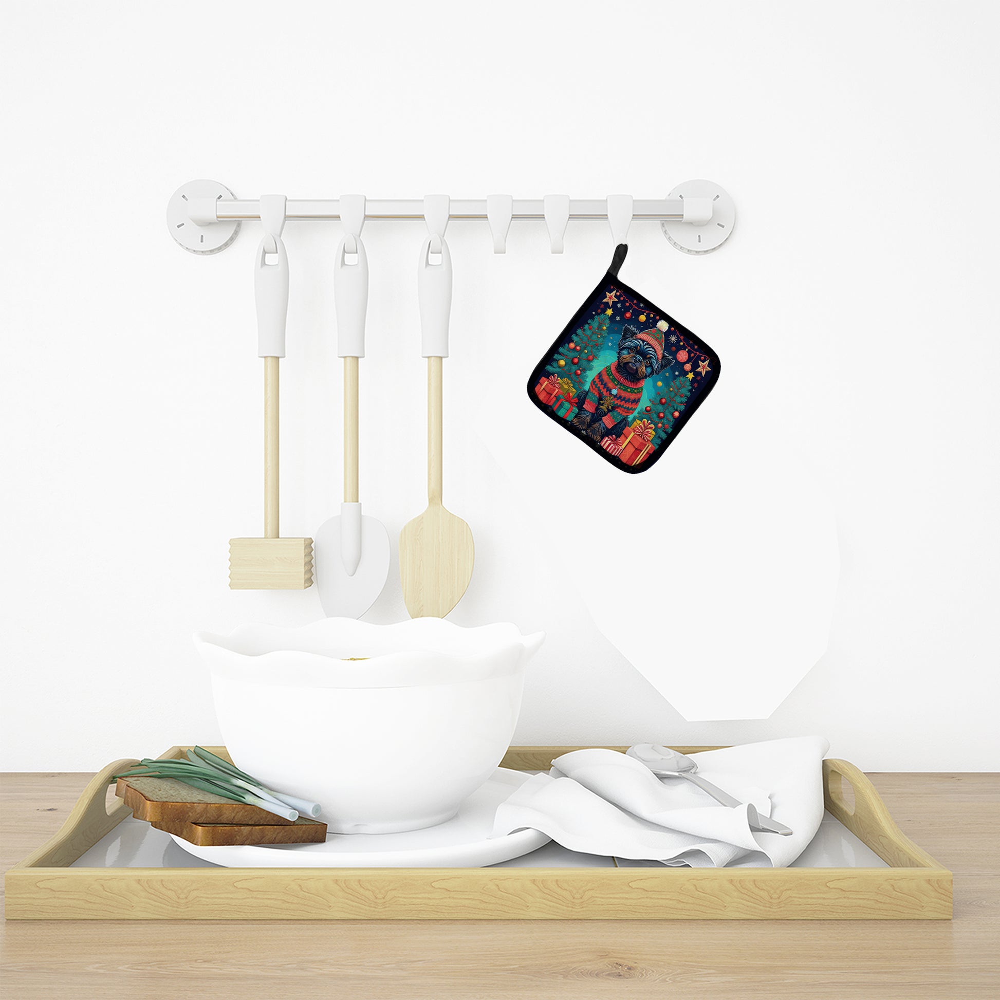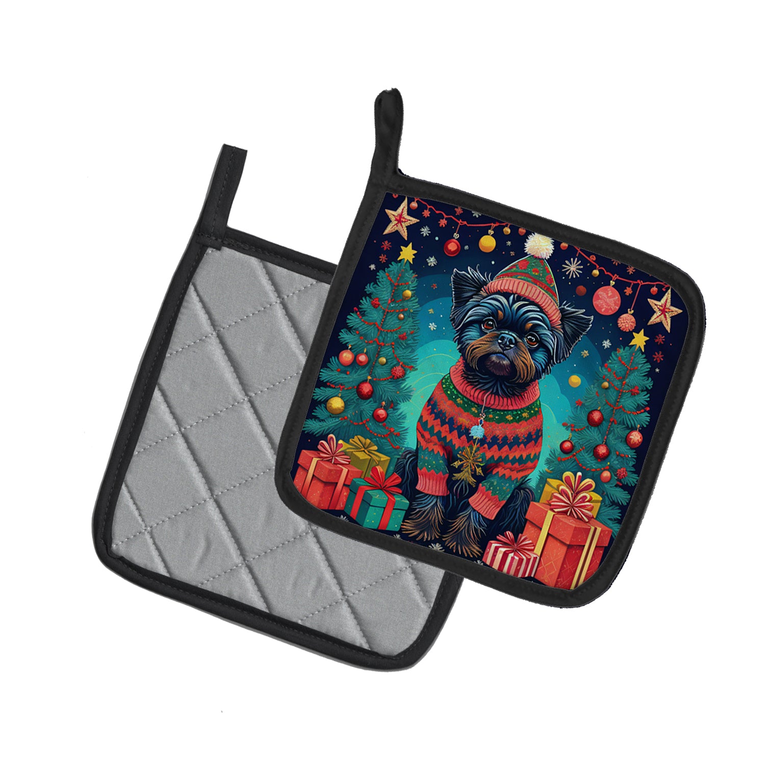 Pair of Pot Holders featuring breed specific Affenpinscher artwork. Celebrate Christmas with this Christmas Pair of Pot Holders. A Pair of Pot Holders to match your kitchen decor. Made in the USA these are thick and functional. Full color artwork decorates the front polyester fabric of the hot pad and accented by a black trim. Use these at as a trivet for your Thanksgiving or Christmas tablescape. Filled with insulated fabric and quilted for durability. These colorful pot holders will make a great gift for your favorite home cook or executive chef. Each pot holder measures approximately 7 1/2 inches by 7 1/2 inches. A hanging tab is included.