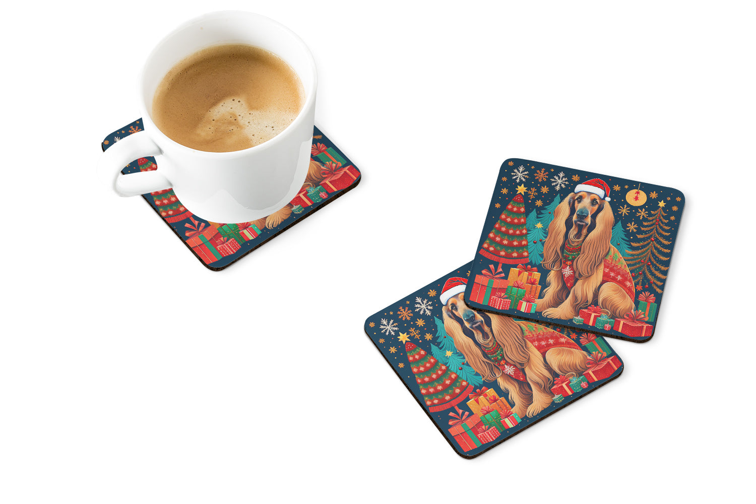 Foam Coasters featuring breed specific Afghan Hound artwork. Celebrate Christmas with this Christmas Coaster set. Presenting our Set of 4 Foam Coasters, a stylish and practical addition to your table setting. Each square coaster, measuring 3 1/2 inches by 3 1/2 inches, is perfectly sized to accommodate various drinkware, from coffee mugs to tumblers. These coasters stand out with their full-color artwork, permanently dyed onto the material for a vibrant and fade-resistant finish. They're not just functional, they're a fashionable statement, adding a touch of flair to any gathering or event. Our foam coasters serve a dual purpose - they protect your table from water stains and are perfect for both hot and cold drinks. The material used is similar to that of our high-quality mouse pads, ensuring durability and heat resistance. These coasters are easy to maintain - simply wash them in the top of your dishwasher and lay flat to dry. The design won't come off, ensuring they retain their vivid colors for years. Pair them with one of our insulated coolers or huggers for a cohesive, thoughtful gift set. Enhance your beverage experience with our Set of 4 Foam Coasters.