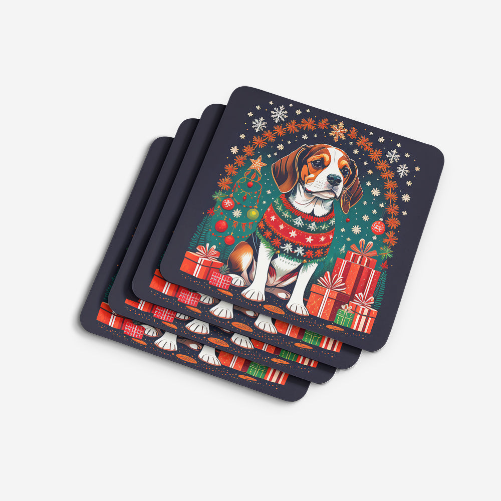 Foam Coasters featuring breed specific Beagle artwork. Celebrate Christmas with this Christmas Coaster set. Presenting our Set of 4 Foam Coasters, a stylish and practical addition to your table setting. Each square coaster, measuring 3 1/2 inches by 3 1/2 inches, is perfectly sized to accommodate various drinkware, from coffee mugs to tumblers. These coasters stand out with their full-color artwork, permanently dyed onto the material for a vibrant and fade-resistant finish. They're not just functional, they're a fashionable statement, adding a touch of flair to any gathering or event. Our foam coasters serve a dual purpose - they protect your table from water stains and are perfect for both hot and cold drinks. The material used is similar to that of our high-quality mouse pads, ensuring durability and heat resistance. These coasters are easy to maintain - simply wash them in the top of your dishwasher and lay flat to dry. The design won't come off, ensuring they retain their vivid colors for years. Pair them with one of our insulated coolers or huggers for a cohesive, thoughtful gift set. Enhance your beverage experience with our Set of 4 Foam Coasters.