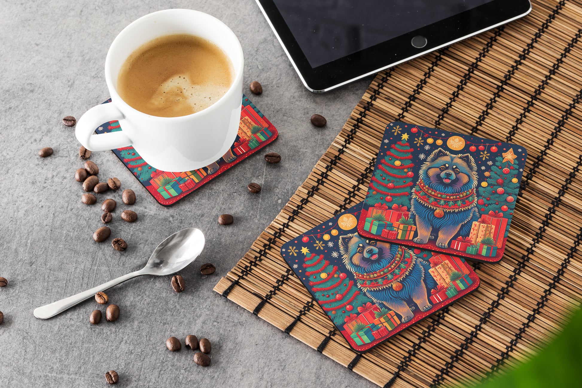 Foam Coasters featuring breed specific Keeshond artwork. Celebrate Christmas with this Christmas Coaster set. Presenting our Set of 4 Foam Coasters, a stylish and practical addition to your table setting. Each square coaster, measuring 3 1/2 inches by 3 1/2 inches, is perfectly sized to accommodate various drinkware, from coffee mugs to tumblers. These coasters stand out with their full-color artwork, permanently dyed onto the material for a vibrant and fade-resistant finish. They're not just functional, they're a fashionable statement, adding a touch of flair to any gathering or event. Our foam coasters serve a dual purpose - they protect your table from water stains and are perfect for both hot and cold drinks. The material used is similar to that of our high-quality mouse pads, ensuring durability and heat resistance. These coasters are easy to maintain - simply wash them in the top of your dishwasher and lay flat to dry. The design won't come off, ensuring they retain their vivid colors for years. Pair them with one of our insulated coolers or huggers for a cohesive, thoughtful gift set. Enhance your beverage experience with our Set of 4 Foam Coasters.