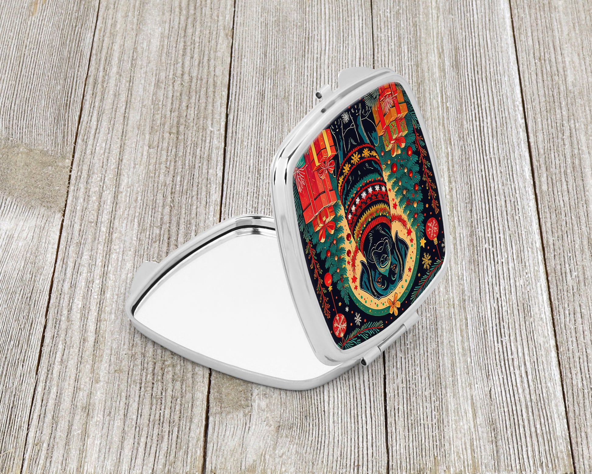 Compact Mirror featuring breed specific Labrador Retriever artwork. Celebrate Christmas with this Christmas Compact Mirror. Introducing our Square Compact Mirror, a blend of elegance, functionality, and compactness, perfect for on-the-go touch-ups. This Silvertone metal mirror, with dimensions of 2.75 inches x 3 inches x .3 inches, fits effortlessly into your purse, handbag, or pocket, ensuring that you can check your appearance anytime, anywhere. Our compact mirror stands out with its eye-catching artwork on the front, adding a dash of style to this practical accessory. It is more than just a mirror; it's a statement piece that reflects your personality and aesthetic. When opened, this compact reveals two mirrors inside, doubling your perspective for precise touch-ups. The Silvertone metal construction ensures durability while maintaining a lightweight feel, making it an ideal everyday carry item. Whether you're rushing to a meeting, prepping for a dinner date, or just need a quick check on your look, our Square Compact Mirror is your reliable companion. Experience the perfect blend of style and practicality with this must-have accessory.