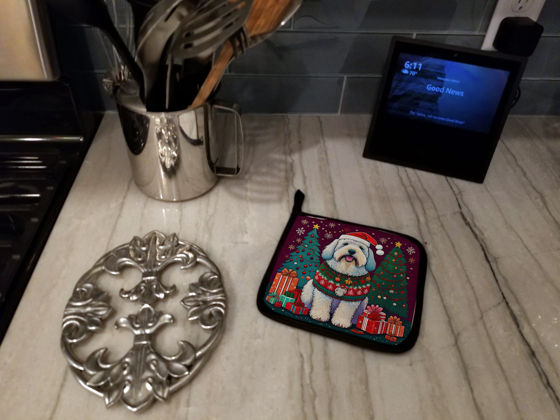 Pair of Pot Holders featuring breed specific Old English Sheepdog artwork. Celebrate Christmas with this Christmas Pair of Pot Holders. A Pair of Pot Holders to match your kitchen decor. Made in the USA these are thick and functional. Full color artwork decorates the front polyester fabric of the hot pad and accented by a black trim. Use these at as a trivet for your Thanksgiving or Christmas tablescape. Filled with insulated fabric and quilted for durability. These colorful pot holders will make a great gift for your favorite home cook or executive chef. Each pot holder measures approximately 7 1/2 inches by 7 1/2 inches. A hanging tab is included.