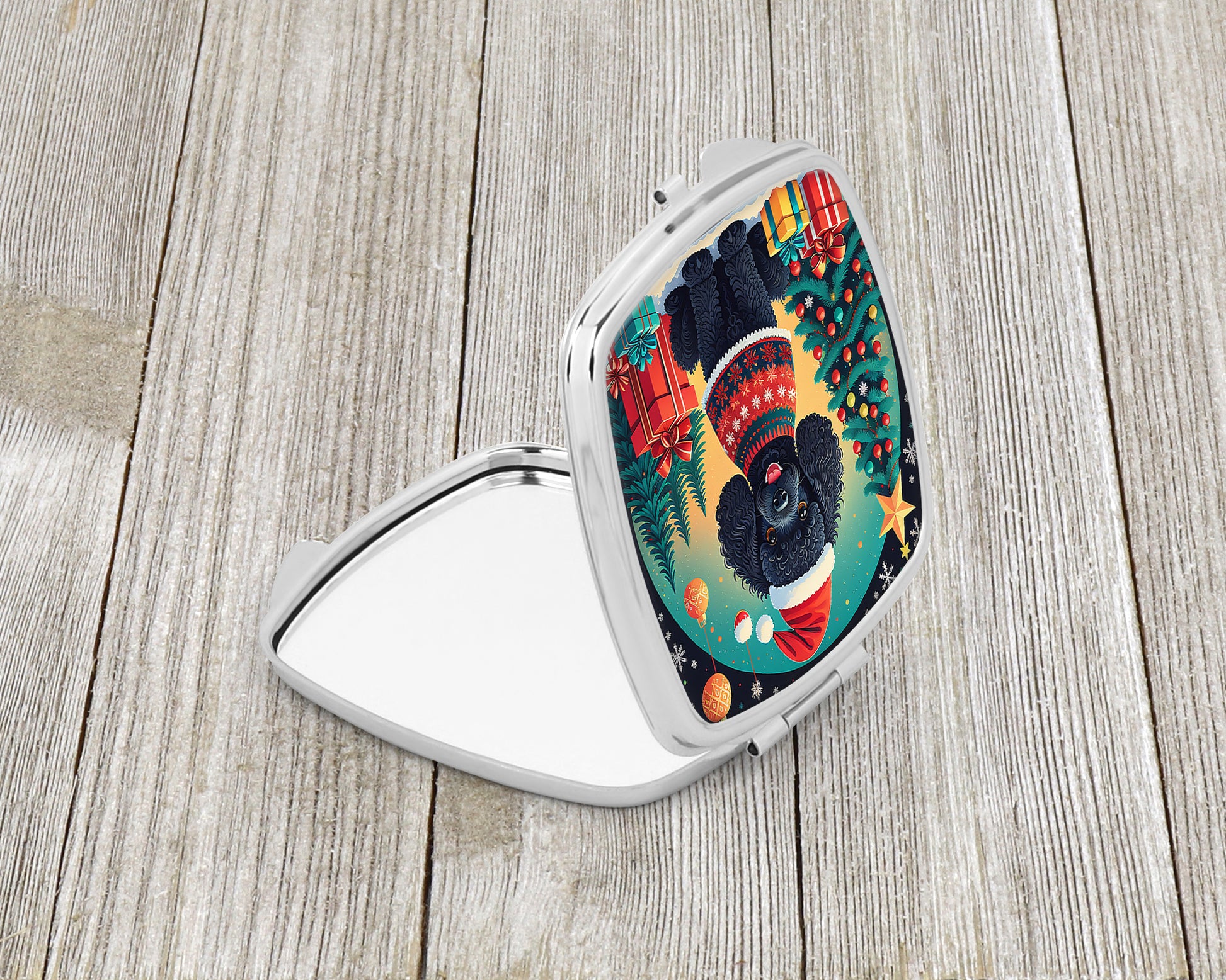 Compact Mirror featuring breed specific Poodle artwork. Celebrate Christmas with this Christmas Compact Mirror. Introducing our Square Compact Mirror, a blend of elegance, functionality, and compactness, perfect for on-the-go touch-ups. This Silvertone metal mirror, with dimensions of 2.75 inches x 3 inches x .3 inches, fits effortlessly into your purse, handbag, or pocket, ensuring that you can check your appearance anytime, anywhere. Our compact mirror stands out with its eye-catching artwork on the front, adding a dash of style to this practical accessory. It is more than just a mirror; it's a statement piece that reflects your personality and aesthetic. When opened, this compact reveals two mirrors inside, doubling your perspective for precise touch-ups. The Silvertone metal construction ensures durability while maintaining a lightweight feel, making it an ideal everyday carry item. Whether you're rushing to a meeting, prepping for a dinner date, or just need a quick check on your look, our Square Compact Mirror is your reliable companion. Experience the perfect blend of style and practicality with this must-have accessory.