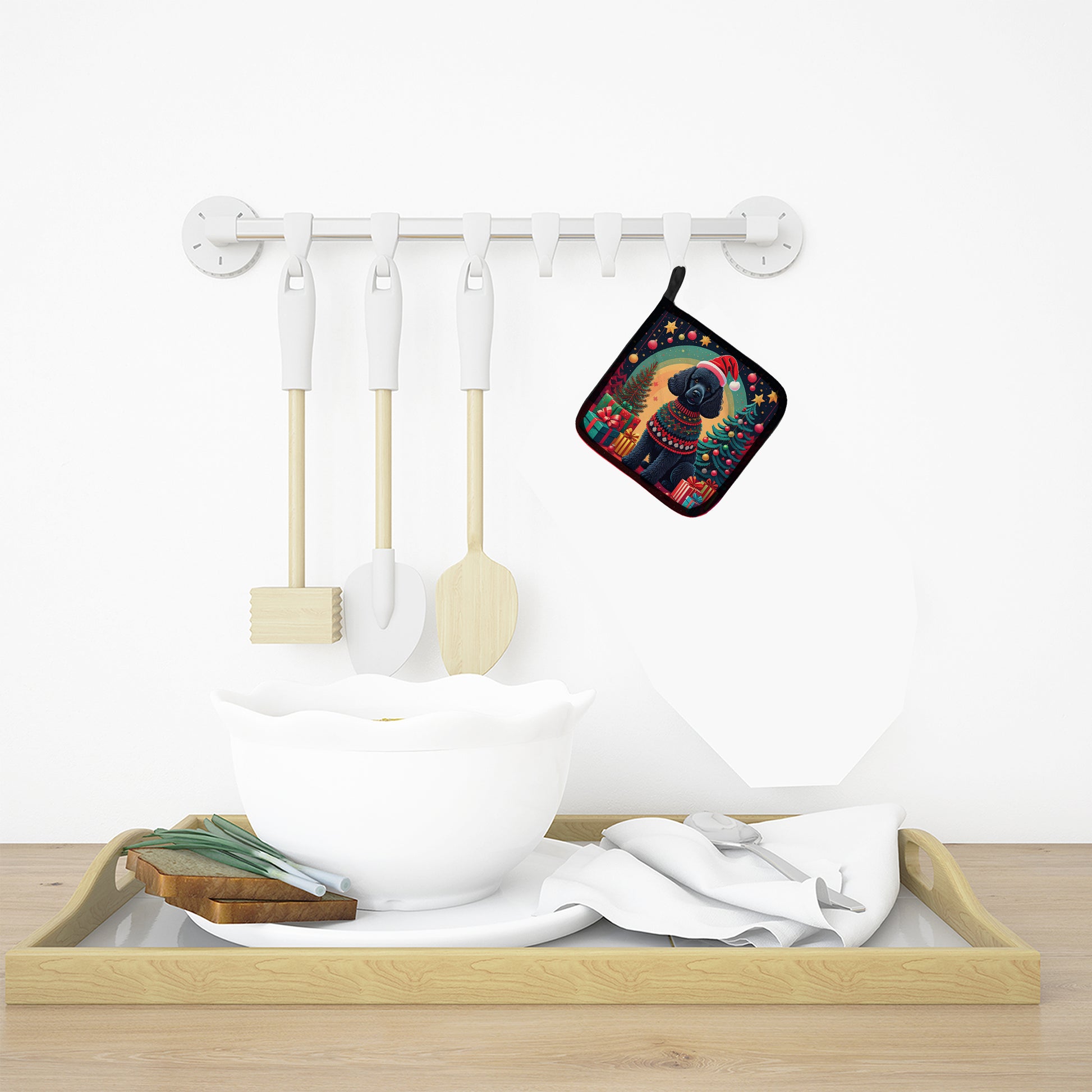 Pair of Pot Holders featuring breed specific Poodle artwork. Celebrate Christmas with this Christmas Pair of Pot Holders. A Pair of Pot Holders to match your kitchen decor. Made in the USA these are thick and functional. Full color artwork decorates the front polyester fabric of the hot pad and accented by a black trim. Use these at as a trivet for your Thanksgiving or Christmas tablescape. Filled with insulated fabric and quilted for durability. These colorful pot holders will make a great gift for your favorite home cook or executive chef. Each pot holder measures approximately 7 1/2 inches by 7 1/2 inches. A hanging tab is included.