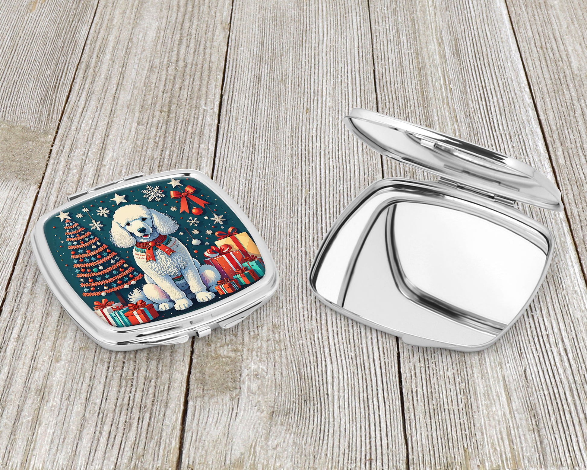 Compact Mirror featuring breed specific Poodle artwork. Celebrate Christmas with this Christmas Compact Mirror. Introducing our Square Compact Mirror, a blend of elegance, functionality, and compactness, perfect for on-the-go touch-ups. This Silvertone metal mirror, with dimensions of 2.75 inches x 3 inches x .3 inches, fits effortlessly into your purse, handbag, or pocket, ensuring that you can check your appearance anytime, anywhere. Our compact mirror stands out with its eye-catching artwork on the front, adding a dash of style to this practical accessory. It is more than just a mirror; it's a statement piece that reflects your personality and aesthetic. When opened, this compact reveals two mirrors inside, doubling your perspective for precise touch-ups. The Silvertone metal construction ensures durability while maintaining a lightweight feel, making it an ideal everyday carry item. Whether you're rushing to a meeting, prepping for a dinner date, or just need a quick check on your look, our Square Compact Mirror is your reliable companion. Experience the perfect blend of style and practicality with this must-have accessory.