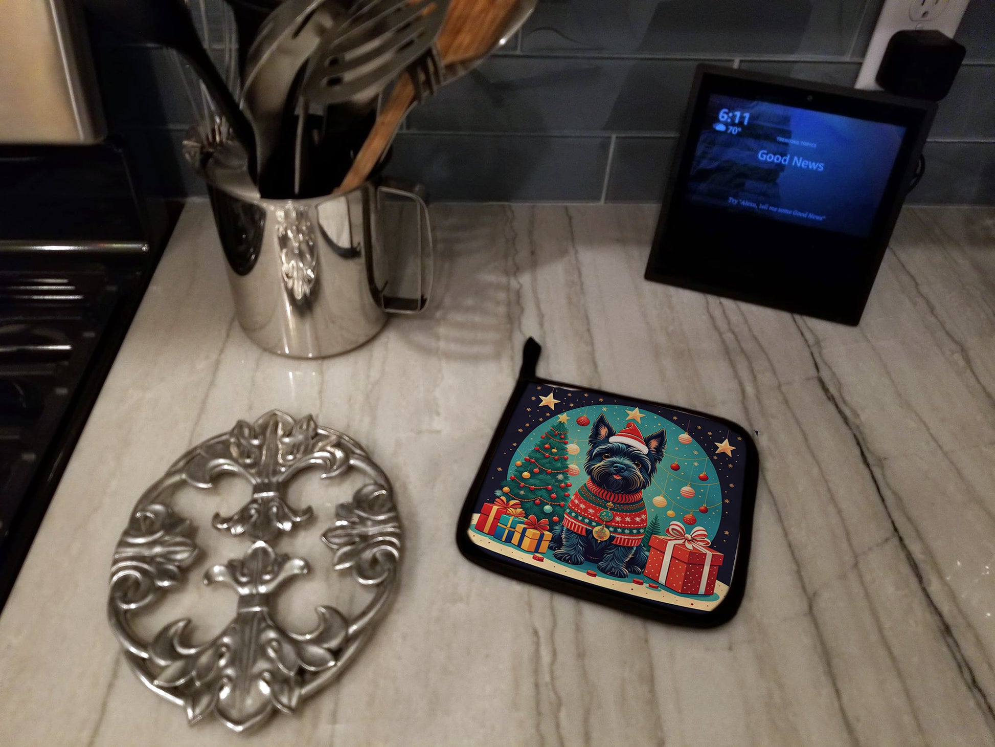 Pair of Pot Holders featuring breed specific Scottish Terrier artwork. Celebrate Christmas with this Christmas Pair of Pot Holders. A Pair of Pot Holders to match your kitchen decor. Made in the USA these are thick and functional. Full color artwork decorates the front polyester fabric of the hot pad and accented by a black trim. Use these at as a trivet for your Thanksgiving or Christmas tablescape. Filled with insulated fabric and quilted for durability. These colorful pot holders will make a great gift for your favorite home cook or executive chef. Each pot holder measures approximately 7 1/2 inches by 7 1/2 inches. A hanging tab is included.