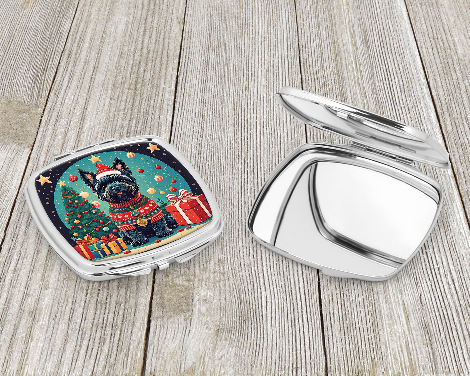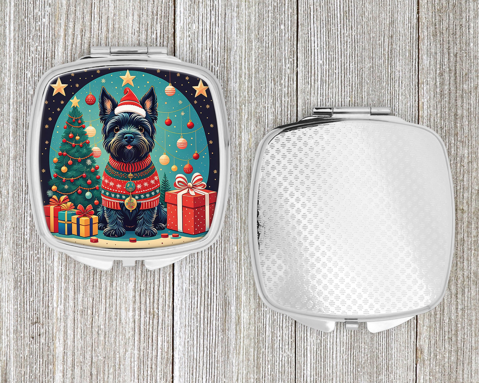Compact Mirror featuring breed specific Scottish Terrier artwork. Celebrate Christmas with this Christmas Compact Mirror. Introducing our Square Compact Mirror, a blend of elegance, functionality, and compactness, perfect for on-the-go touch-ups. This Silvertone metal mirror, with dimensions of 2.75 inches x 3 inches x .3 inches, fits effortlessly into your purse, handbag, or pocket, ensuring that you can check your appearance anytime, anywhere. Our compact mirror stands out with its eye-catching artwork on the front, adding a dash of style to this practical accessory. It is more than just a mirror; it's a statement piece that reflects your personality and aesthetic. When opened, this compact reveals two mirrors inside, doubling your perspective for precise touch-ups. The Silvertone metal construction ensures durability while maintaining a lightweight feel, making it an ideal everyday carry item. Whether you're rushing to a meeting, prepping for a dinner date, or just need a quick check on your look, our Square Compact Mirror is your reliable companion. Experience the perfect blend of style and practicality with this must-have accessory.