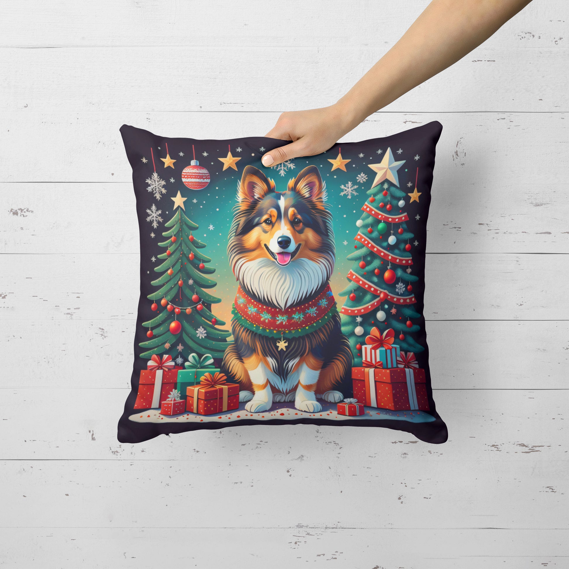 Throw Pillow featuring breed specific Sheltie artwork. Celebrate Christmas with this Christmas Pillow. Add a touch of vibrancy and comfort to your outdoor seating with Caroline's Treasures Fabric Decorative Pillow. Measuring approximately 14 inches by 14 inches, this outdoor pillow is crafted to elevate the appeal of your patio furniture, infusing it with vivid color and artistic flair. The pillow includes a 100% Polyester Fabric sham filled with a quality pillow form to provide superior comfort. Innovatively made from our brand new material, specifically woven for its water resistance, this pillow is designed for durability. The soft canvas fabric offers versatility in use, fit for your indoor couch or your outdoor patio, porch, or veranda. The fabric is dyed with colorfast dyes built for resilience against weather conditions, ensuring the pillow retains its beauty over time. Constructed by sewing three fabric pieces to create a sham, the polyester insert is then nestled inside to form the pillow, resulting in an overstuffed pillow that maintains its shape. Both the sham and the pillow insert are proudly made in the United States. As the pillows are handcrafted, there may be minor variations in size, further enhancing their unique charm. Experience comfort in style with Caroline's Treasures Fabric Decorative Pillow.