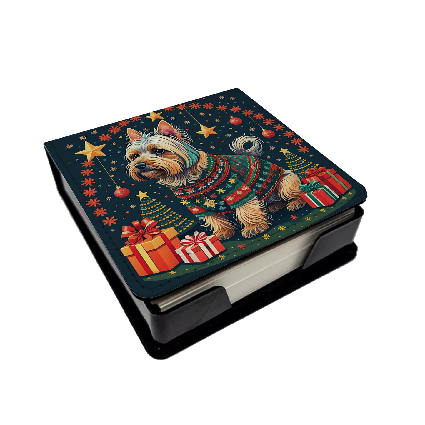 PU Leather Note Paper Holder featuring breed specific Silky Terrier artwork. Celebrate Christmas with this Christmas Note Paper Holder. Elevate your workspace with this PU Leather Note Paper Holder, crafted to resemble luxurious leather without the use of animal products. Made from durable synthetic PU leather, it offers both a premium look and eco-friendly appeal. This note holder, compactly sized at 4.25 x 4.25 x 1.25 inches, includes about 160 sheets of 3.75 x 3.75-inch note paper—ideal for quick notes and reminders. An exclusive artist-designed cover makes each holder uniquely vibrant, adding a splash of color and personality to any desk or office. The discrete design keeps note paper hidden, maintaining a neat and organized workspace. Perfect as a gift or for personal use, this stylish holder is refillable with standard paper, ensuring long-lasting utility. A must-have for anyone seeking a sophisticated, artful touch to their workspace while supporting animal-friendly products. Add style, organization, and creativity to your everyday routine with this elegant note paper holder.
